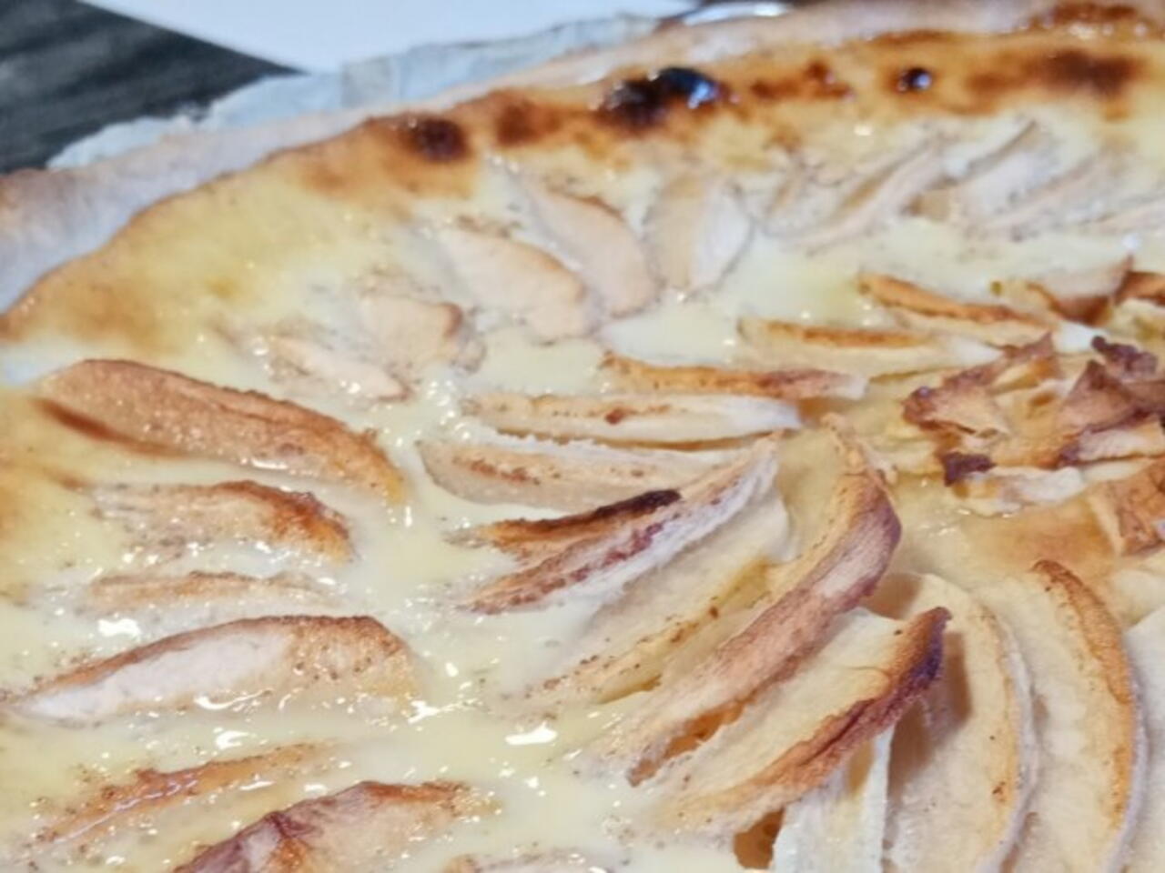 Pour changer de la classique tarte fine aux pommes sur lit de compote, je vous propose aujourd'hui une recette plus crémeuse et tout aussi bonne :